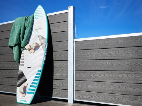 Hvis du drømmer om en hegnsløsning, der kræver minimal vedligeholdelse, så kan dette fine Fur Classic komposithegn være en klassisk og funktionel løsning i dit uderum. Hegnet har en flot overflade med træstruktur, og det er opbygget omkring en såkaldt V-profil. Det karakteristiske ved denne V-profil er, at det skaber et grafisk mønster i brættet og gør, at de vandrette brædder glider ind i harmoni med hinanden fra bund til top. Det skaber en symmetrisk profil, der giver et stilfuldt udtryk. Langs stolpen finder du lys, som kan tilføje en hyggelig atmosfære til udearealet.
