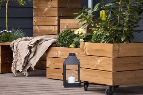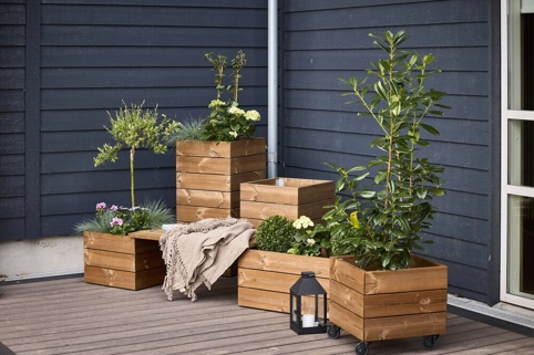 Du kan bl.a. bruge plantekassen kreativt i kombination med andre kasser i forskellige størrelser til at opbygge struktur og liv til uderummet. Den er perfekt til både nybegyndere og erfarne havemennesker. Gør plantekassen mere mobil og flytbar ved at tilkøbe hjul.