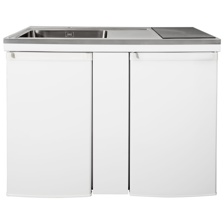 Inkl. køkkenvask (venstre), metalskab og kogeplade